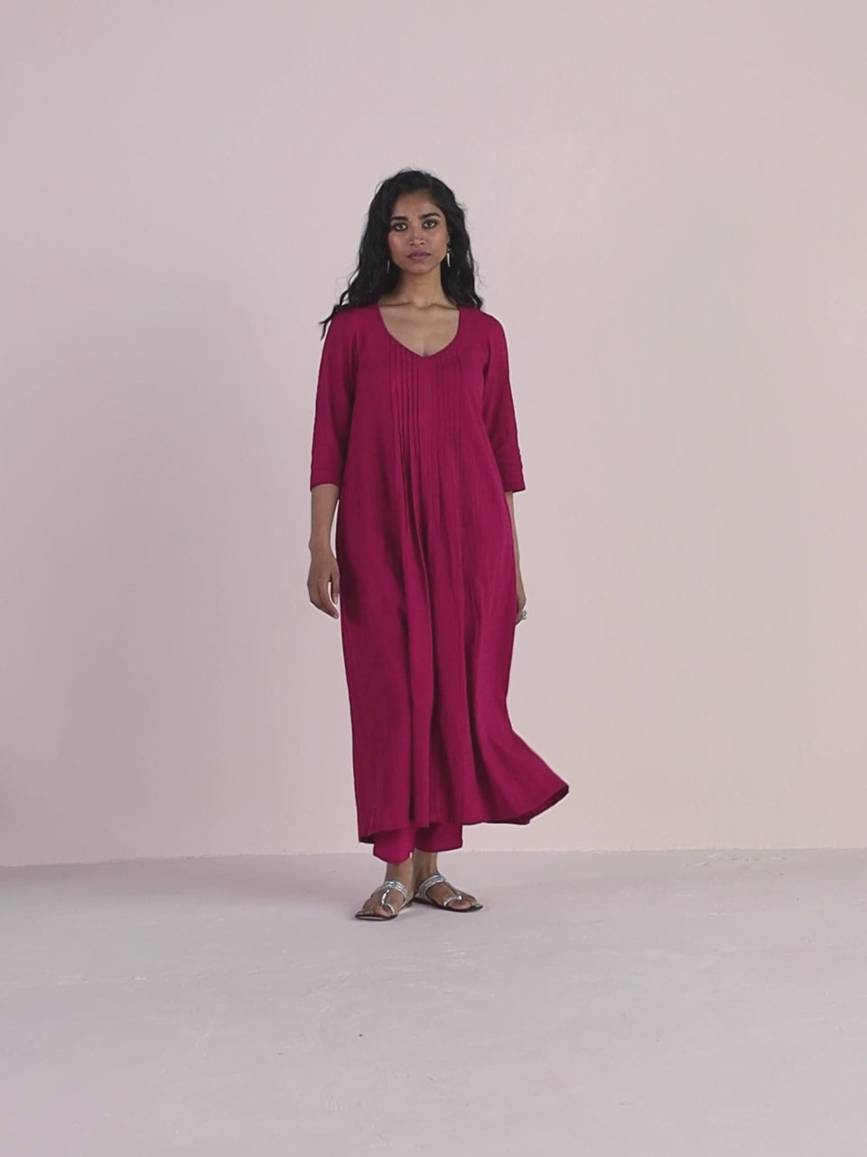 - Cotton Dobby Kurta with Round-V neckline, three-fourth sleeves and pin tucks detailing on the front in flared fit. Paired with elasticated waist pant.