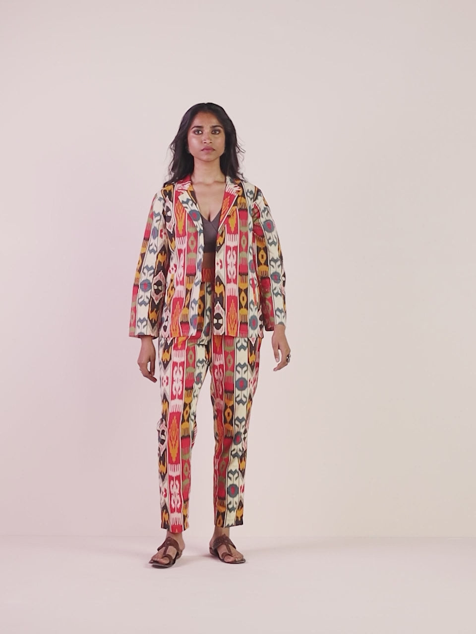 - Cotton Ikat Stripe Printed Pant Suit Set with lapel collar,full sleeves and hook & eye closure in front for jacket. It has inner overlap blouse and paired with high waisted trousers.