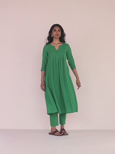 - Cotton Kurta with Round-neck slit, three-fourth sleeves and gathered yoke in flared fit. Paired with elasticated waist pant.