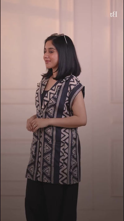 - Elevate your style with this cotton printed double breasted jacket complemented by solid green flared pants, it's an ideal blend of elegance and comfort.