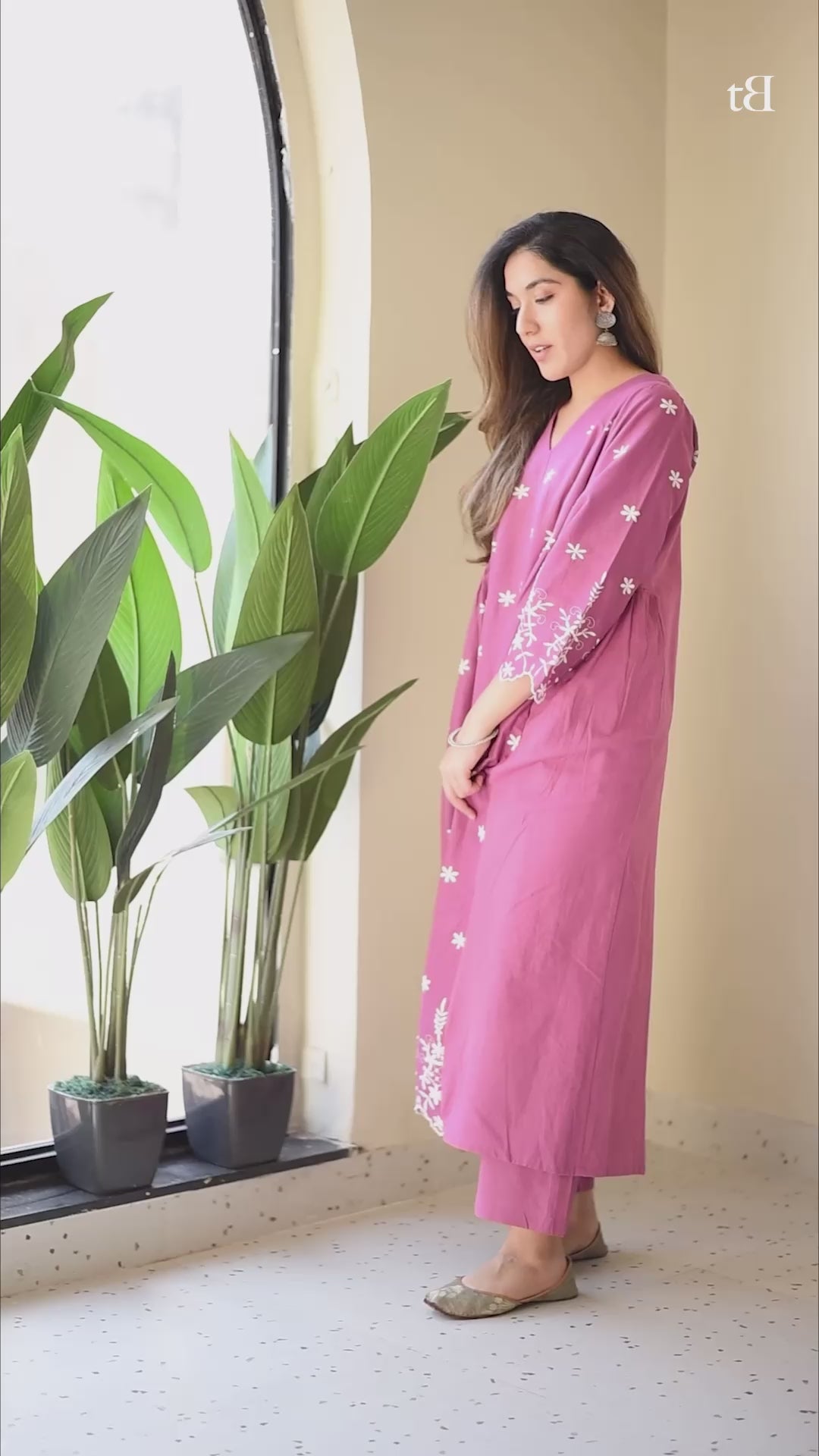 trueBrowns Pink Cotton Floral Embroidered Flared Kurta Set