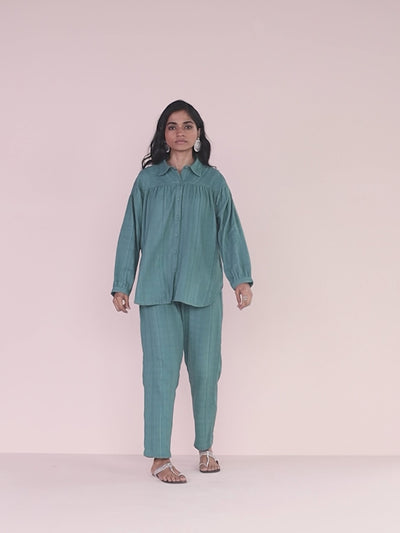 - Cotton Dobby Shirt Co-ord Set with gathered yoke and sleeves, front buttons, collar and sleeve cuff. Paired with half elasticated waist pant.